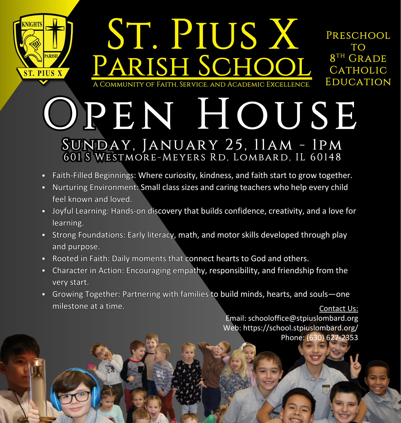 At St. Pius X Parish School, we are educating bright, motivated, and compassionate students, preschool through 8th grade, in a family-centered community based on the Catholic faith and service to others.