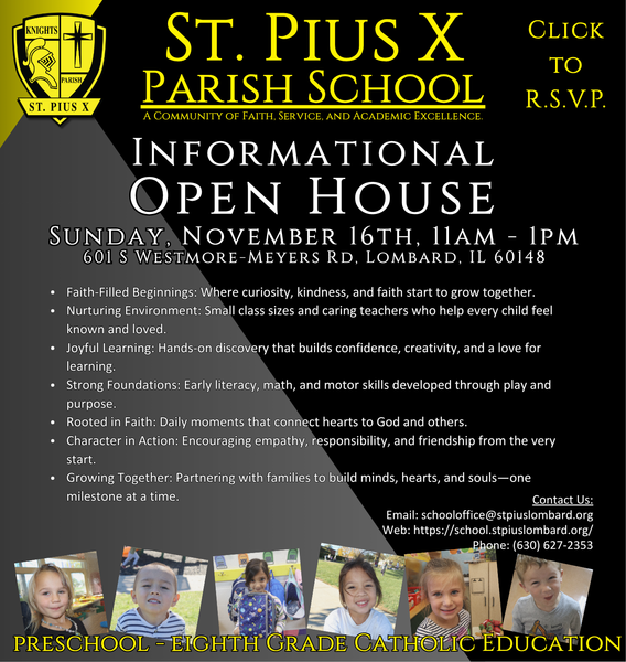 At St. Pius X Parish School, we are educating bright, motivated, and compassionate students, preschool through 8th grade, in a family-centered community based on the Catholic faith and service to others.